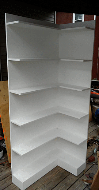 This 6 tier shelf is made out of 3/4 inch pine plywood and is custom made to fit that particular corner. A great place to display your special collections. This unit has 13 1/2 inch space in between each shelf giving ample room for the items you would like to display. It also has a electrical outlet cutout and 1 1/2 inch holes in the back corner to run electric to each shelf to give power where needed. Price starting at $549.95