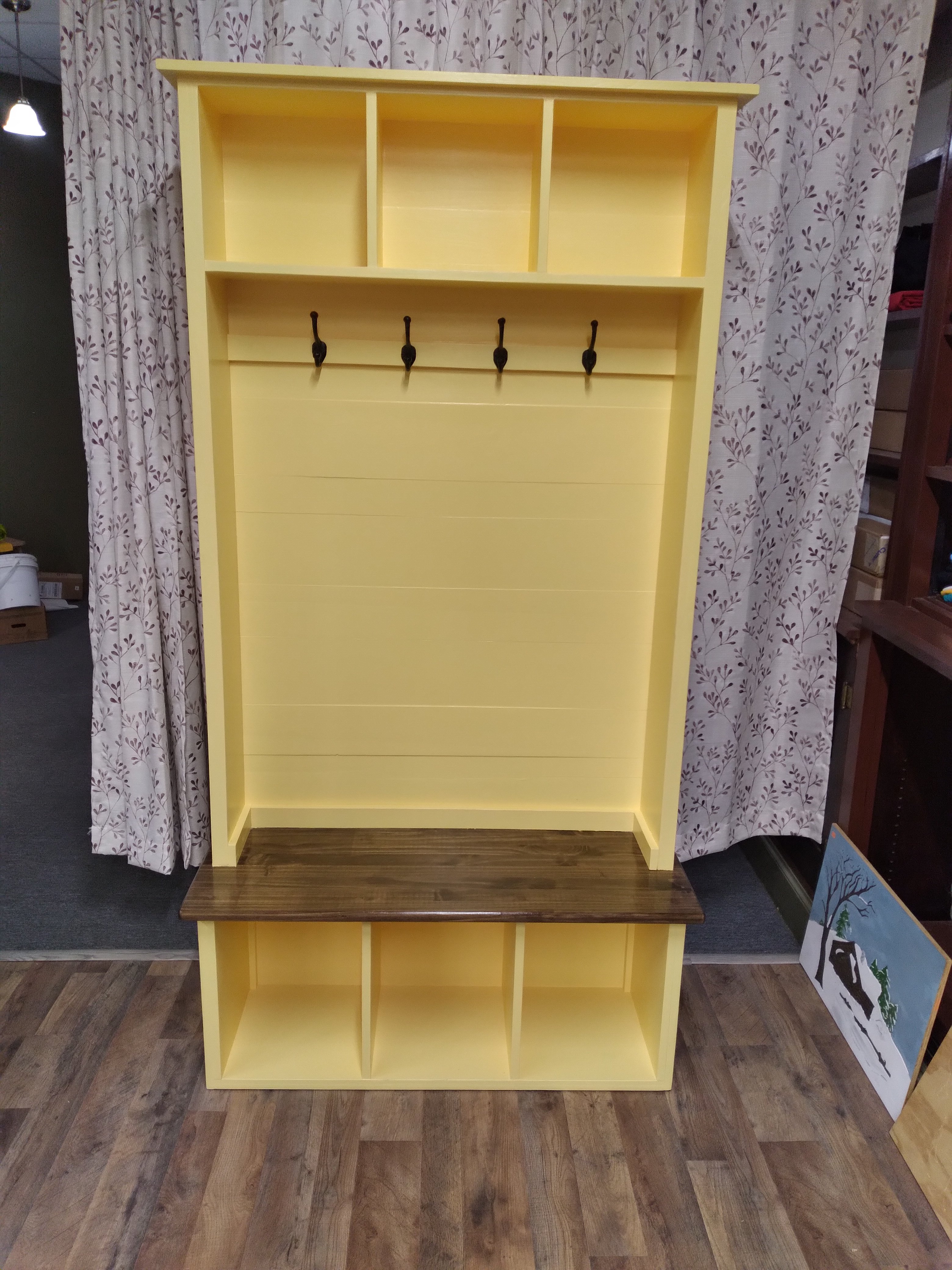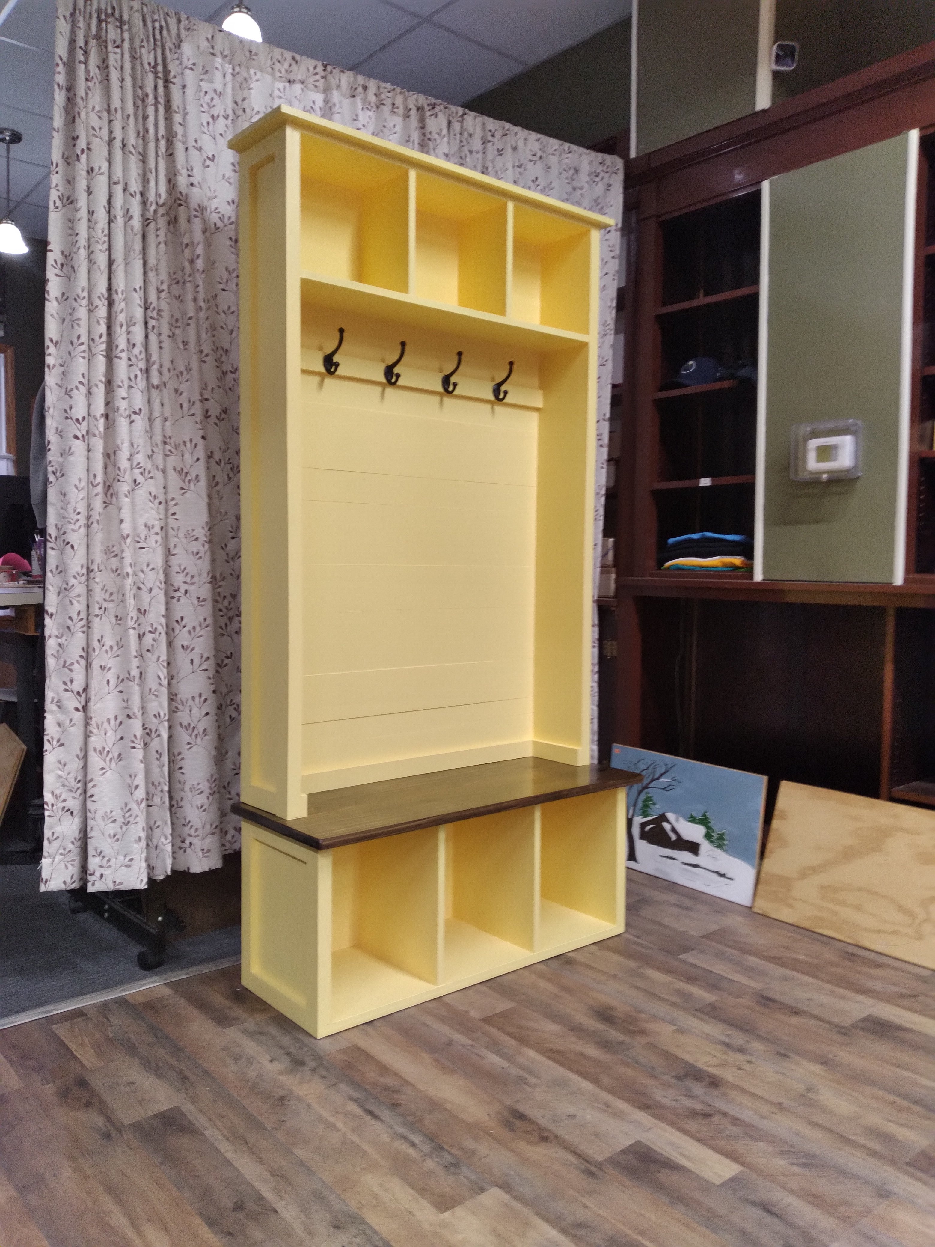 Custom made in our shop in Mifflinburg Pennsylvania. This one pictured sells for $899.95 and is 42 inch wide by 80 inches high and has 3 storage units on top and 3 under the bench. It has 4 coat racks and is plenty of room for your needs. Prices Starting at $799.95